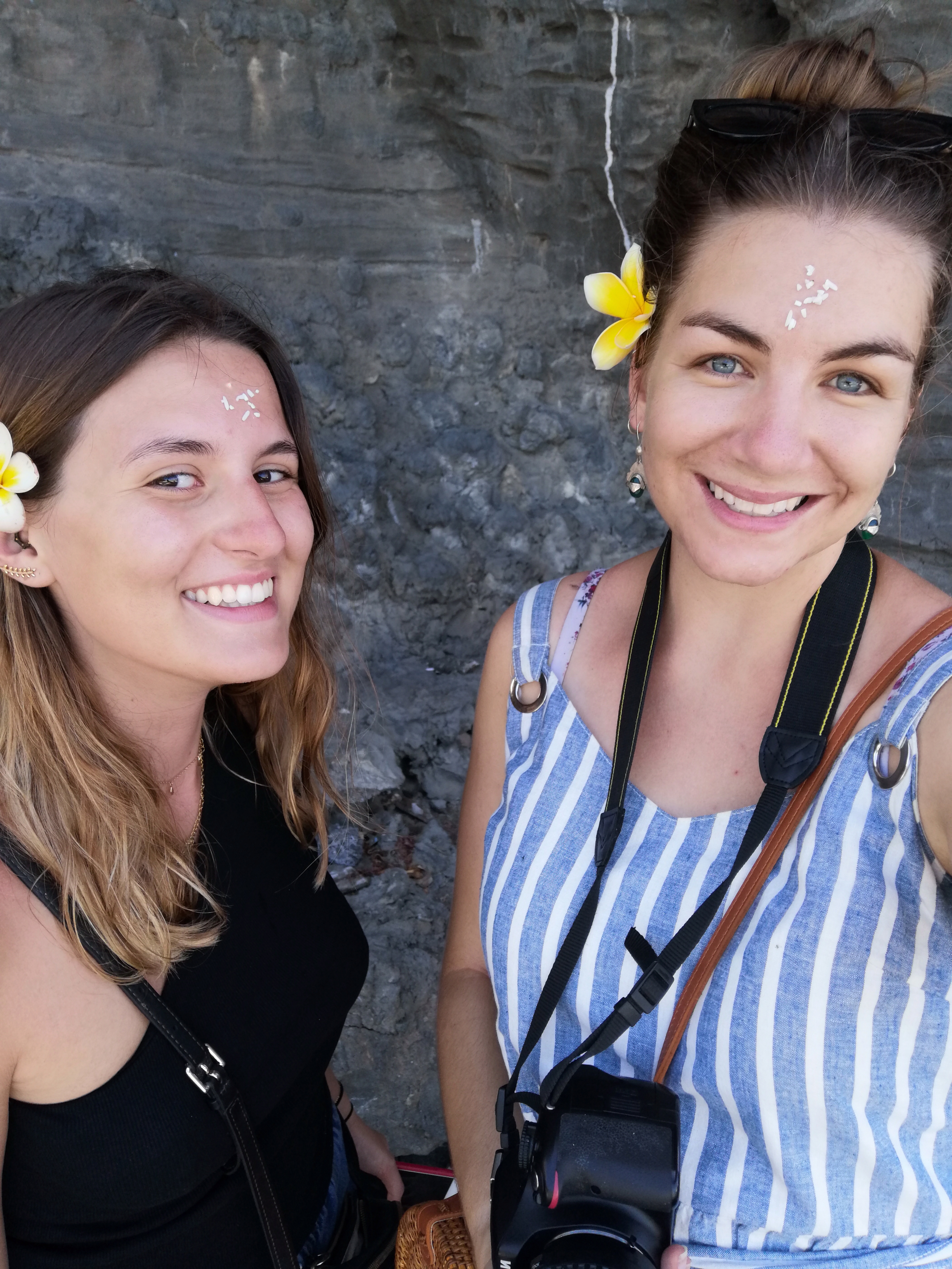 Une fois la voiture récupérée, nous nous sommes dirigées vers le temple de Tanah Lot où après avoir bu l’eau du temple, nous avons été baptisées d’une fleur et de grains de riz écrasés sur le front, signe de bénédiction.