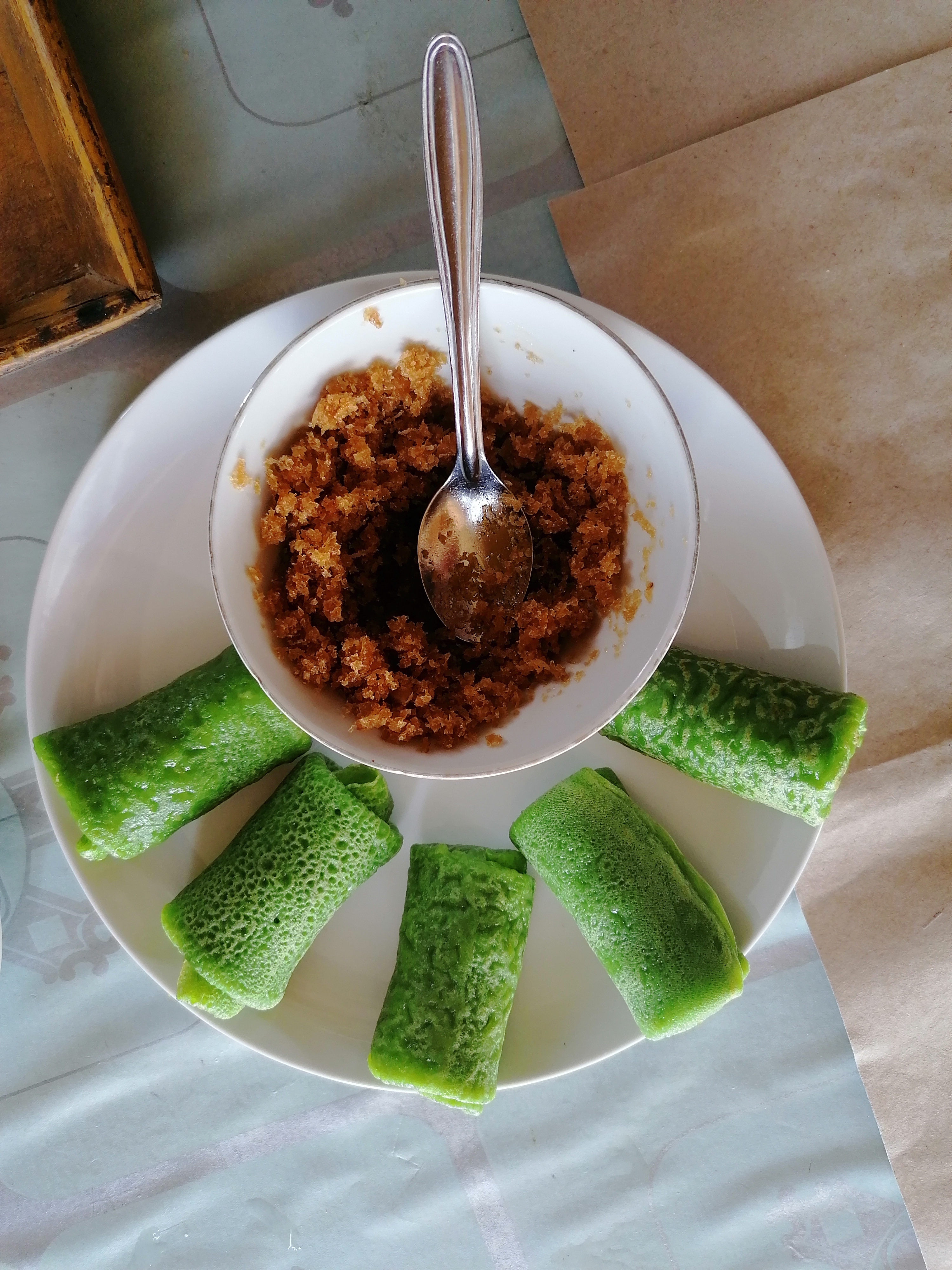 Nous avons cuisiné un menu avec en entrée une soupe de poulet (Ares Ayam), en plat un Lawar Babi (sauce coco, haricots et porc, servi avec du riz) et en dessert des Lak Lak, les fameuses crèpes vertes fourrées à la noix de coco et au sucre de palme.