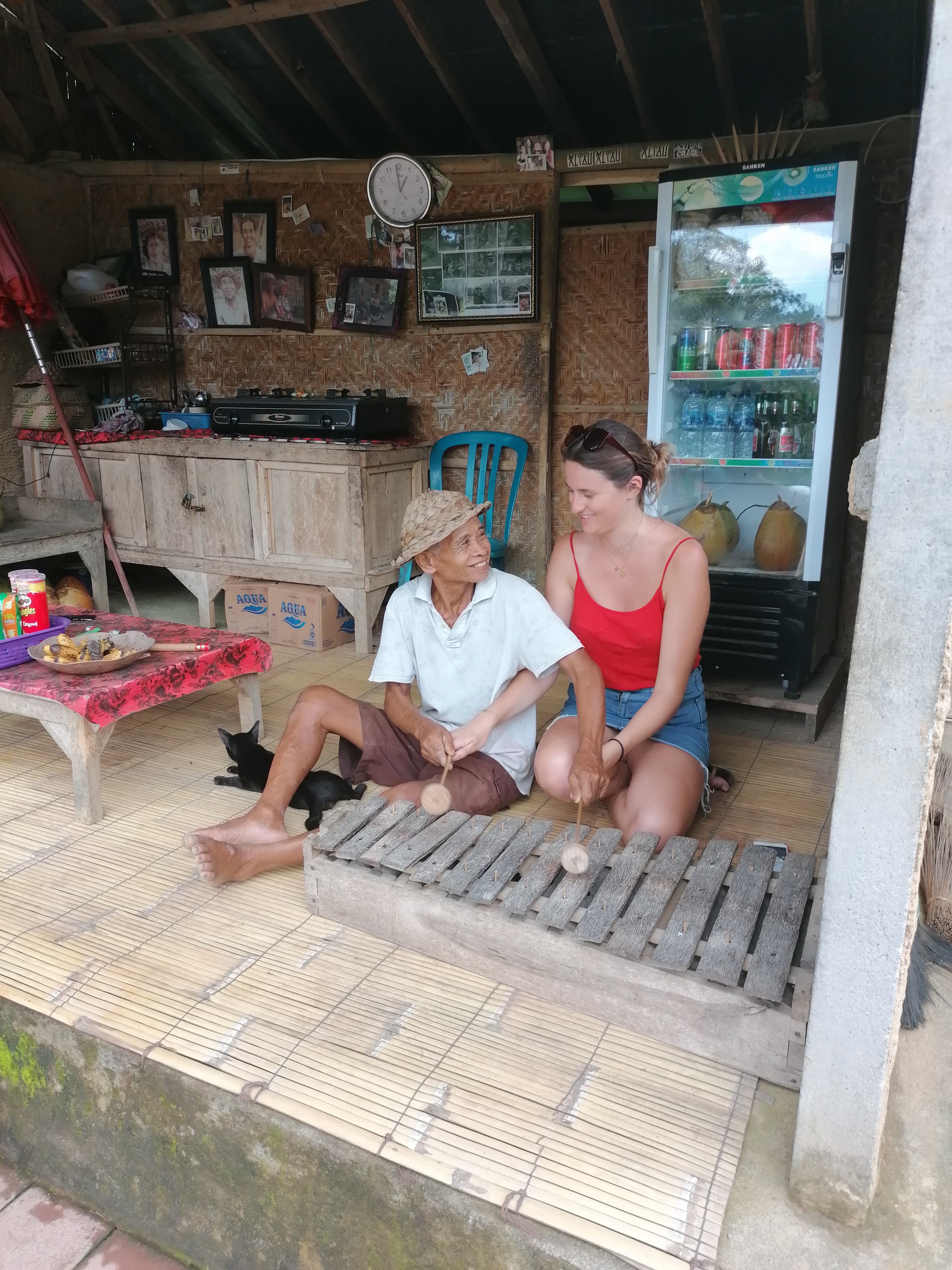 Nous avons visité les rizières de Tegallalang Rice Terraces avec une chaleur et une humidité qui compliquaient l’ascension des grandes marches en terre. Là bas nous avons rencontré un petit papy qui jouait du Xylophone et qui a initié Claire à sa musique, une petite mamie qui nous a demandé de s’assoir à coté d’elle et qui communiquait avec son sourire, et un petit paysan à qui on a acheté des donuts balinais et qui nous a conduit faire une dégustation de café et de thé de toutes sortes comme le café à l’avocat ou le mangoostine tea.