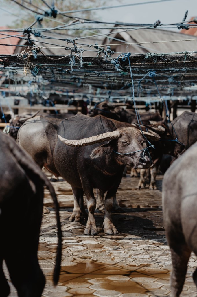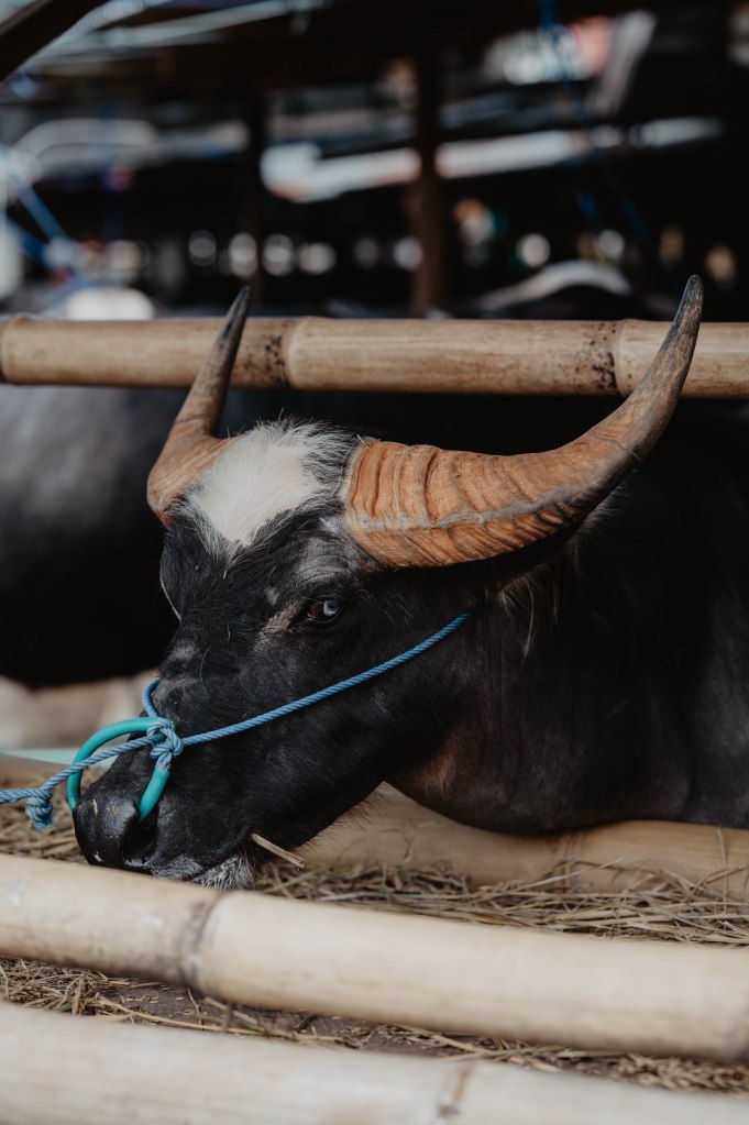Les buffles sont sacrés car selon la croyance des torajas, car c’est eux qui amènent les défunts au paradis. Lors de notre visite au village traditionnel de kete kesu, nous découvrons que de nombreux buffles ont été sacrifiés dans ce village. Devant les maisons, les cornes sont fixées sur une poutre vertical, pour symboliser l’escalier vers le paradis.