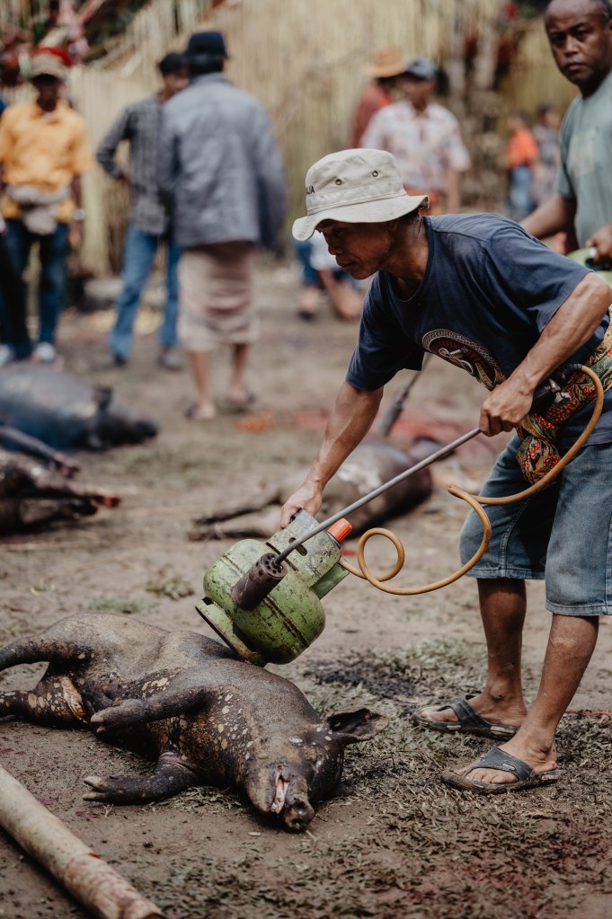 3ème jour au pays des Toraja, nous assistons à une crémaillère ! C’est le 3ème et dernier jour de la cérémonie, le plus important. Il est rare d’assister à une crémaillère car elle s’organise après la construction ou la rénovation d’une maison traditionnelle. Comme les cérémonies funéraires, elles peuvent s’organiser des années plus tard, le temps de récolter assez d’argent. Lors de notre arrivée, nous découvrons une vraie boucherie. Cette fois ce ne sont pas des buffles mais des cochons, tués par dizaine, grillés au chalumeau, puis coupés en morceaux, tout ça sur la place principale du village ! Nous assistons à quelques dances traditionnelles et à une longue messe. A l’heure du repas, nous mangeons les cochons qui ont été sacrifiés le matin. Vous l’aurez compris, lors d’une cérémonie Toraja, les sacrifices permettent de nourrir les personnes présentes (souvent des centaines).
