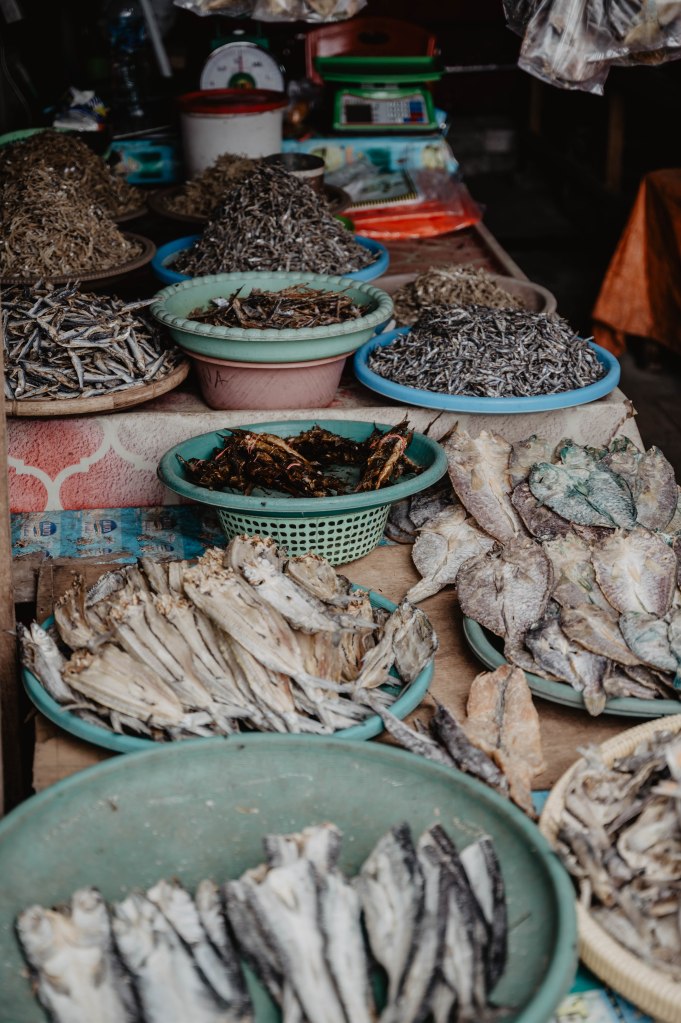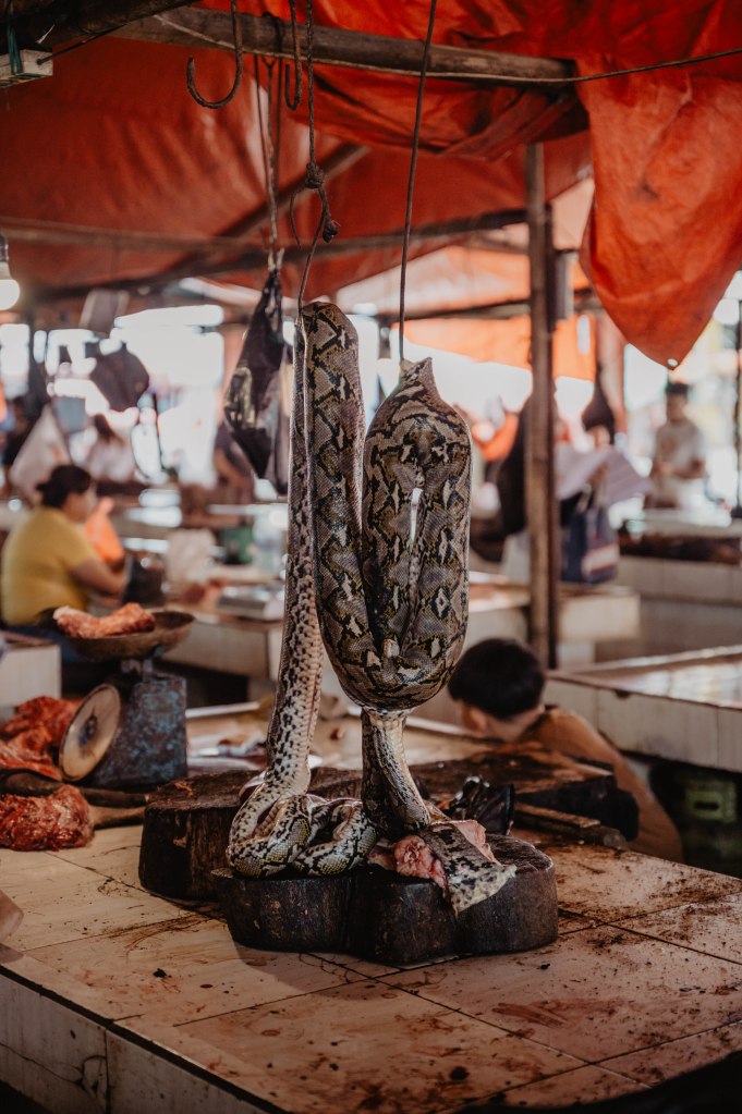 ● Le marché de l’extrême : S’il y a une chose qui fait parlé à Tomohon, c’est bien le marché ! On y trouve des chauves-souris grillées, des chiens, du sanglier, des rats et même des pythons. On arrive vers midi et les stands ne sont pas tous ouverts (ou déjà fermés). Depuis 2023, un accord a été signé avec les vendeurs « extreme », pour ne plus tuer les chats et chiens devant les gens. Nous n’avons pas vu de chats et les chiens étaient déjà morts 🫣 L’autre partie du marché est « normale », avec beaucoup de stands de fruits et de légumes, des poissons et babioles. Vous verrez également des petits stands « d’animaux de compagnie » à savoir des poussins colorés et des bernards l’hermite aux carapaces décorées que l’on peut mettre dans une petite maison en mousse. Une chose est sûre, ce marché local dépayse !