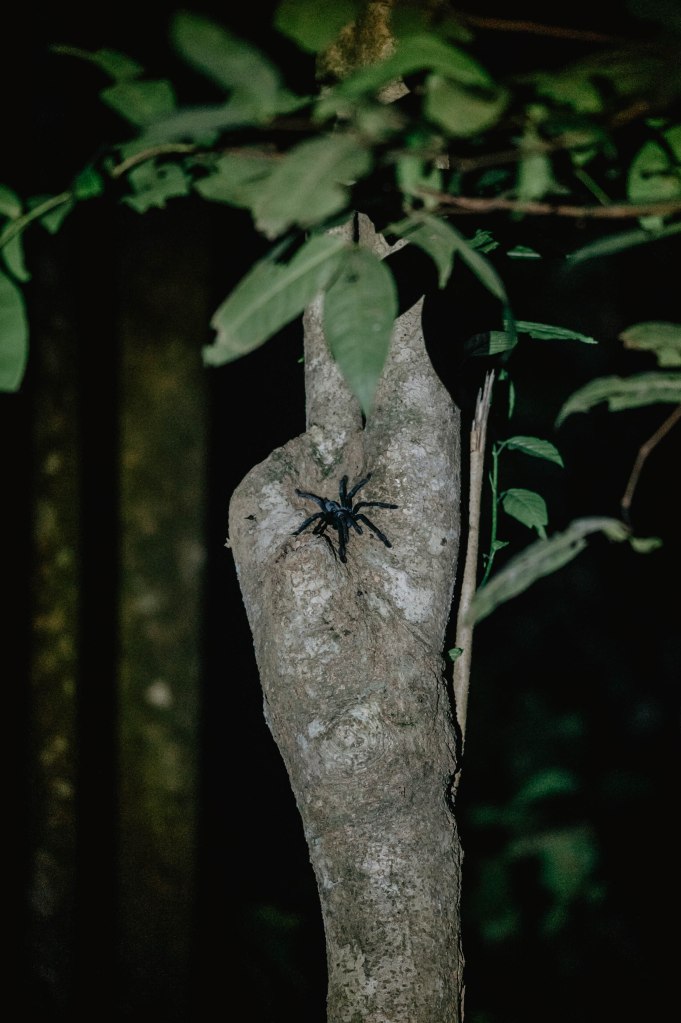 Nous partons avec 2 guides de notre homestay et heureusement car sans elles nous n’aurions pas vu grand chose ! On commence par une tarentule, énorme, puis un tout petit oiseau jaune et blanc, caché sous une feuille. Les animaux semblent avoir leur cachette, les guides savent exactement où les trouver.