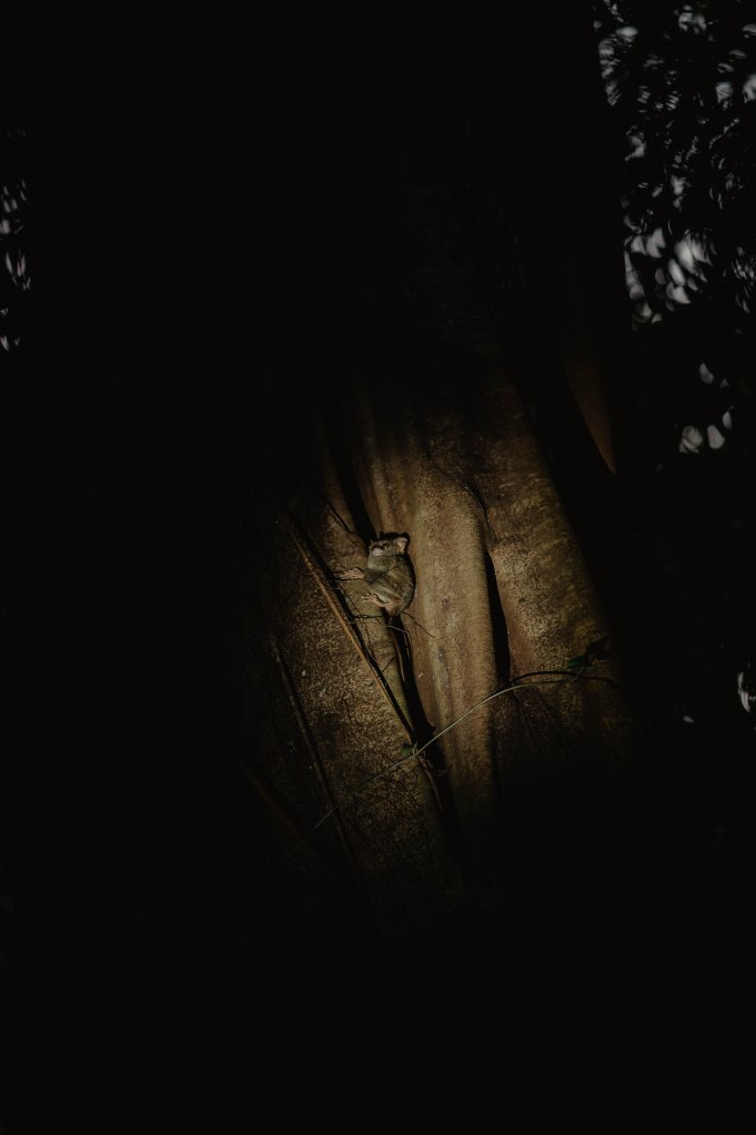 Nous voyons ensuite nos premiers tarsiers, ils sont 3 mais se cachent assez rapidement dans l’arbre. Un peu plus loin, nous en apercevons 2 autres qui restent un bon moment sur l’arbre. Notre guide principale n’est pas très bavarde, nous n’avons aucune explication sur la faune ce qui est un peu dommage. Heureusement, nous savons que le tarsier est un animal très peureux et qu’il faut être le plus discret possible pour ne pas les effrayer. Nous avions vu que certains guides ont des longues vues sur trépied pour pouvoir mieux observer les animaux et faire des photos plus facilement, ce n’était pas le cas de notre guide qui a galéré avec sa paire de jumelle.