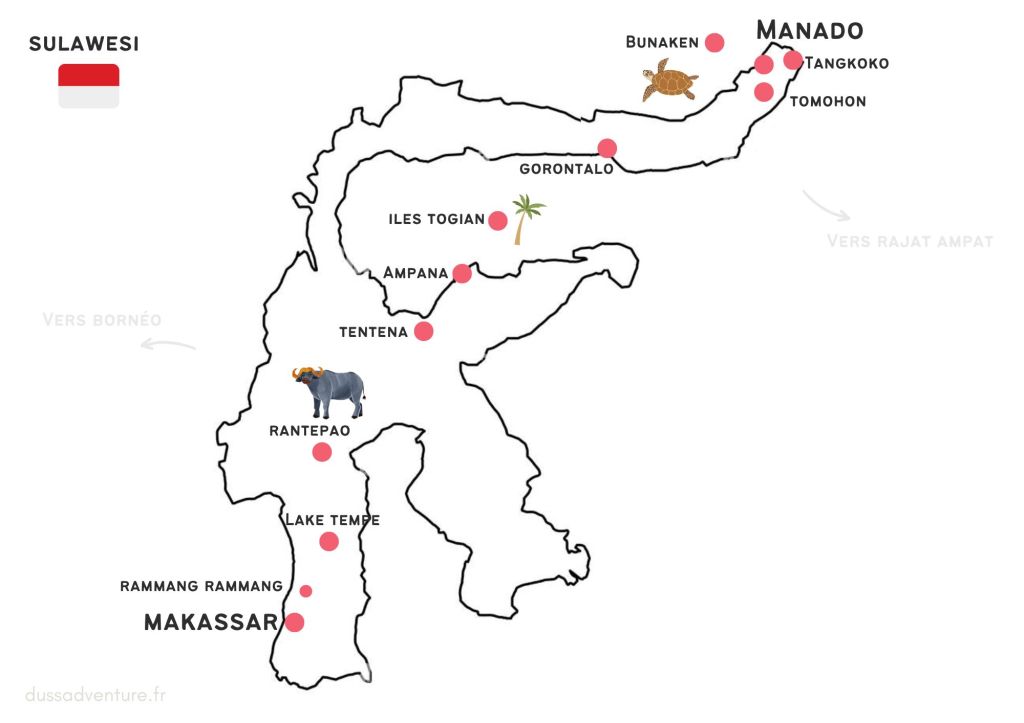 Place à notre itinéraire pour ces 25 jours et 27 nuits de voyage à Sulawesi. Nous sommes arrivés à Makassar et repartis de Manado. Nous avons donc réalisé notre itinéraire du Sud vers le Nord.